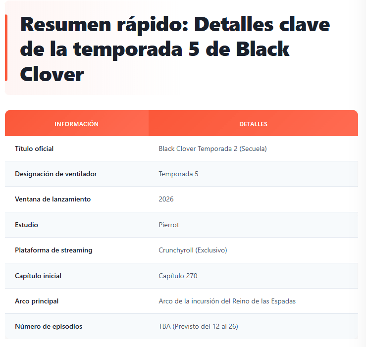 Aunque aún no hay una fecha oficial confirmada, las fuentes apuntan a que el regreso de Black Clover está previsto para principios o mediados de 2026. La producción ya está en marcha y se han mostrado artes promocionales que confirman el avance del proyecto.